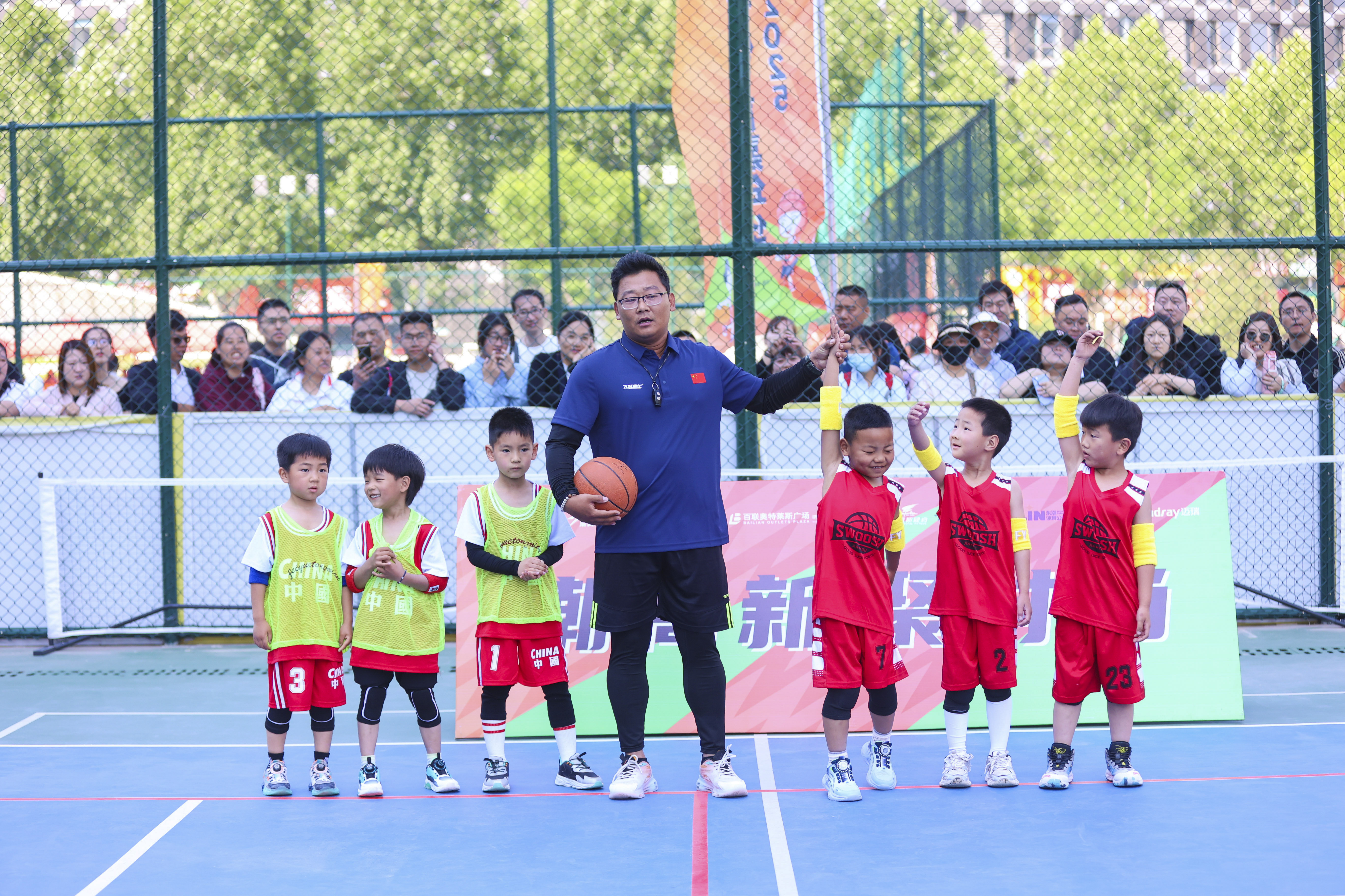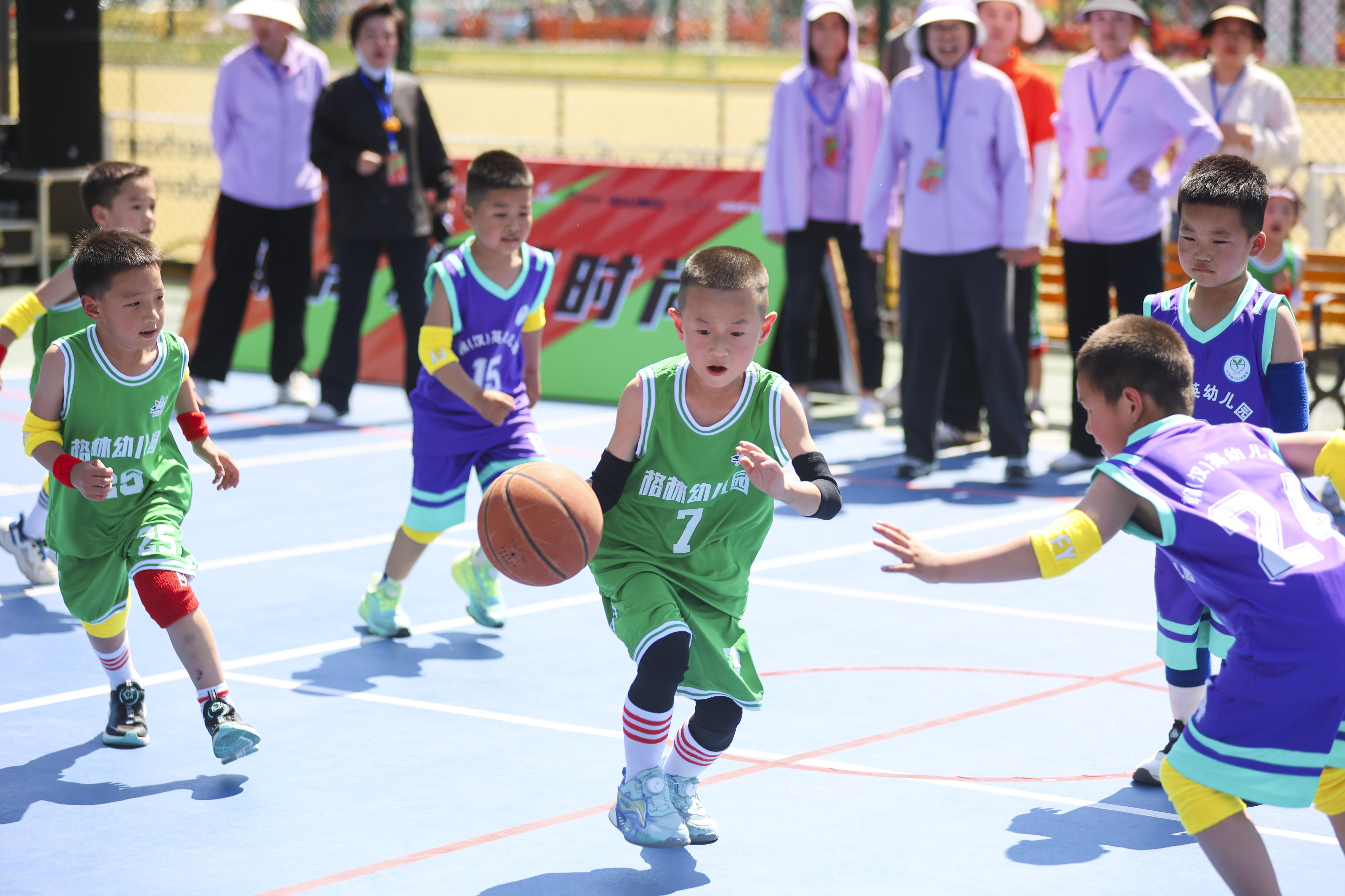 活动现场,萌娃们化身小小运动员,在绿茵场和篮球场上尽情奔跑、热情参与、默契配合。在5vs5幼儿腰旗橄榄球趣味团体活动中,孩子们相互配合,灵活躲避对手,避免被扯下腰旗,展现了出色的团队协作能力;在3vs3幼儿篮球趣味团体活动环节,萌娃们熟练地运球、传球,小小的身体迸发出大大的能量,时不时还有精彩投篮。萌娃的家长们围拢在活动场地四周,每到精彩处,齐刷刷地为萌娃们加油鼓劲,欢呼声、喝彩声不断,整个舜泰体育公园变成了一片欢乐的海洋。