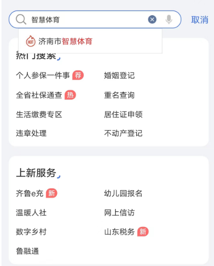 1.下载“爱山东”APP,注册登录后,选择济南分厅,在检索框内输入“智慧体育”即可进入专区。