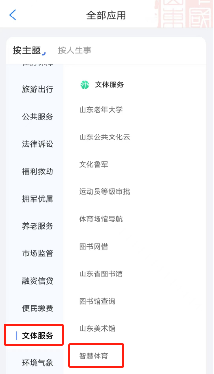 3.或者通过“爱山东”首页选择“热门服务”点击查看全部,在“文体服务”选择“智慧体育”