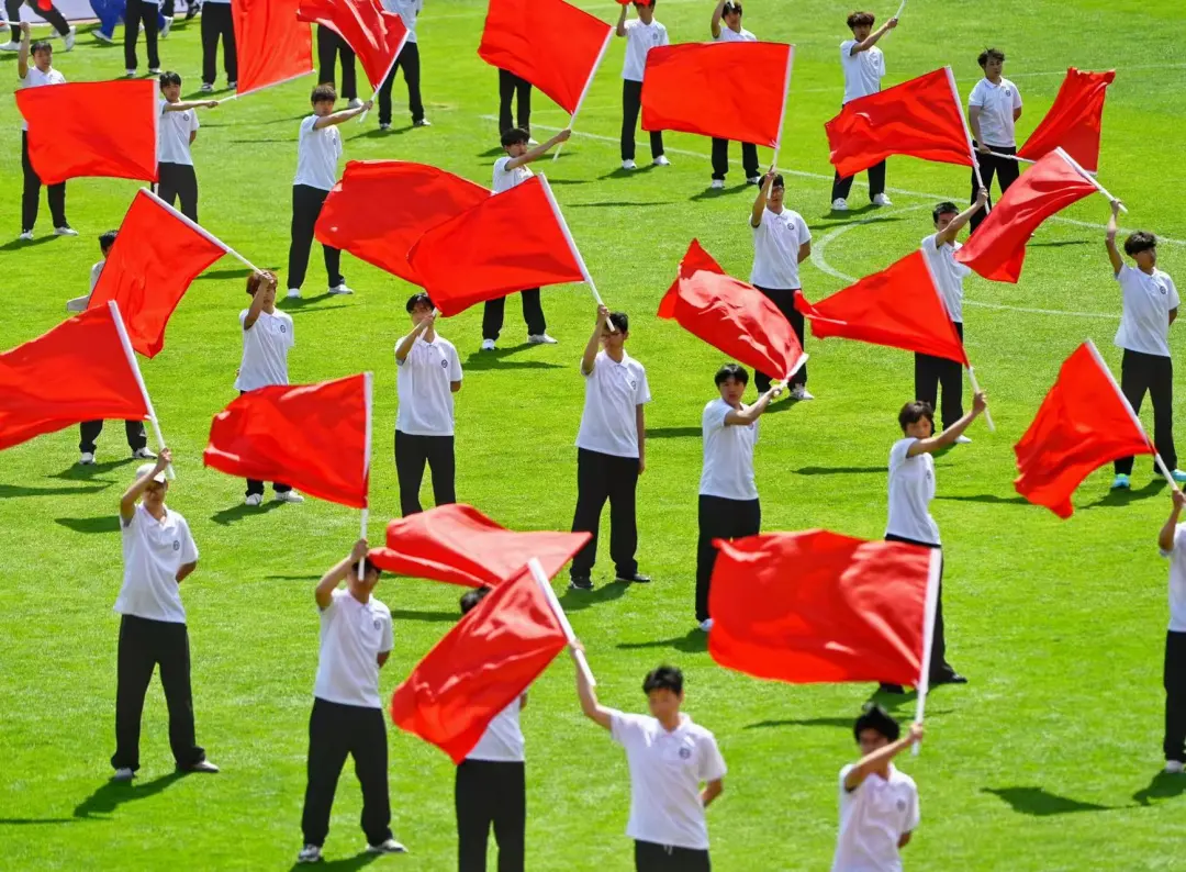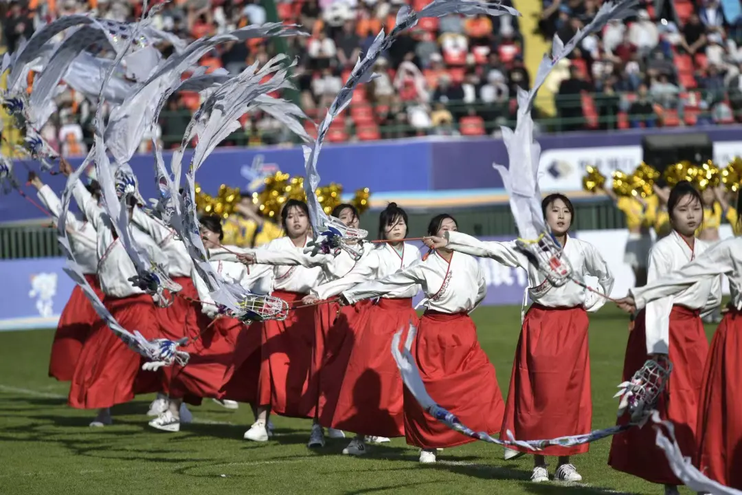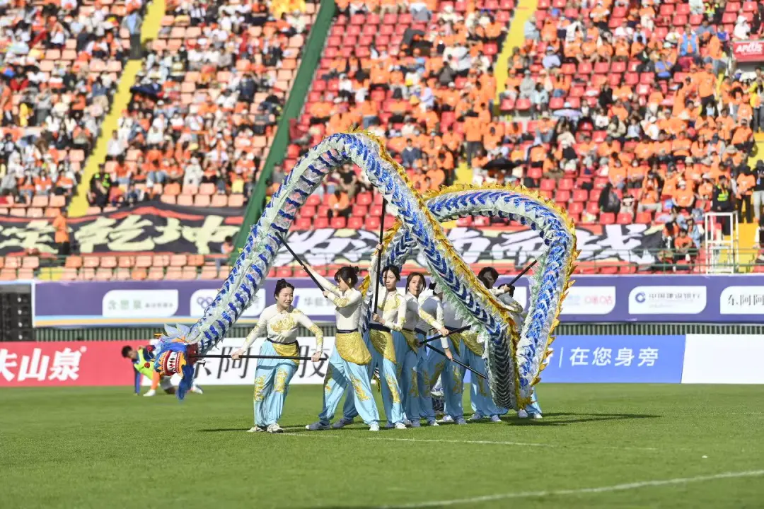 下午3时,开幕式在济南英才学院239名学子带来的大型团体舞蹈《奋斗的你了不起》中热烈启幕。舞者以整齐划一的动作、昂扬向上的姿态,诠释了新时代青年的奋斗精神,瞬间点燃全场气氛。紧随其后的是20余辆张雪机车悬挂齐鲁超赛旗帜绕场巡游,四架直升机编队穿场助威,空飘气球与卡通玩偶穿梭互动,空中轰鸣与地面巡游一并,为观众带来视觉与情绪的双重冲击。随后,歌手深情演唱改编的歌曲《齐鲁超赛微山湖绿茵谣》,将微山湖的柔美风光与绿茵赛场的火热激情巧妙融合,成为赛场一道清新而温暖的风景线。中场休息期间,山东协和学院110人团队带来震撼人心的龙狮秀《龙虎秀》,雄狮腾跃、金龙盘舞,配合激昂的鼓点,展现出齐鲁儿女的豪迈气概。