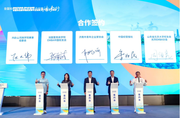 济南市青年企业家协会、山东省北京大学校友会光华EMBA分会、法国里昂商学院EMBA中国校友会、中国经营报社、共赴山河商学院赛事组委会签订战略合作协议,在推动校企地合作、服务企业高质量发展等多个领域共同探索创新发展的新路径、新模式,为济南经济发展注入新的强大动力。