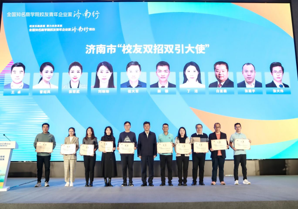 为充分用好商学院校友组织及校友青年企业家资源,助力济南双招双引,宣传济南的人才政策、惠企政策,吸引更多校友投身到济南的发展建设中,交流会上,市领导为校友青年企业家颁发济南市“校友双招双引大使”聘书。